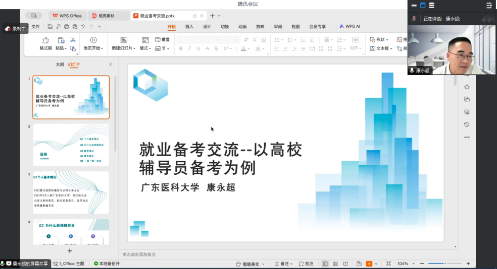 随后,校友康永超从个人基本情况、为什么选择辅导员、备考情况、备考建议等方面分享了他自身的就业经验,并结合自身的工作体会,为各位同学们提供了真诚实用的建议,同时他强调了职业规划和积极准备的重要性,鼓励同学们在就业道路上不断前行、追求卓越。