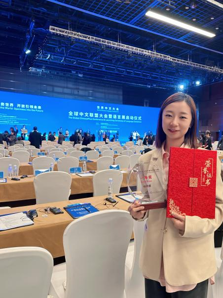 此次比赛的颁奖仪式于12月7日在北京召开的“全球中文联盟大会”上举行,杨雨蒙同学与其他院校的获奖选手代表参加了此次颁奖仪式。