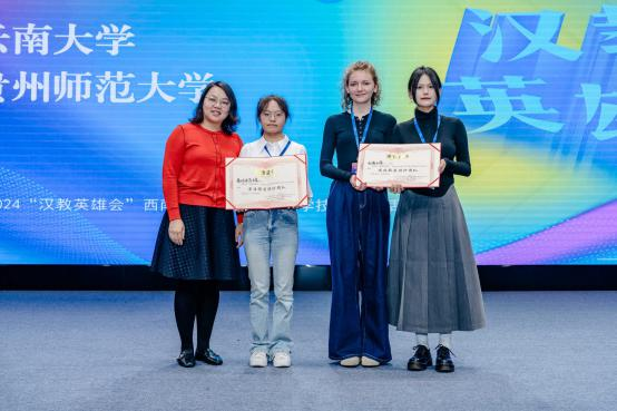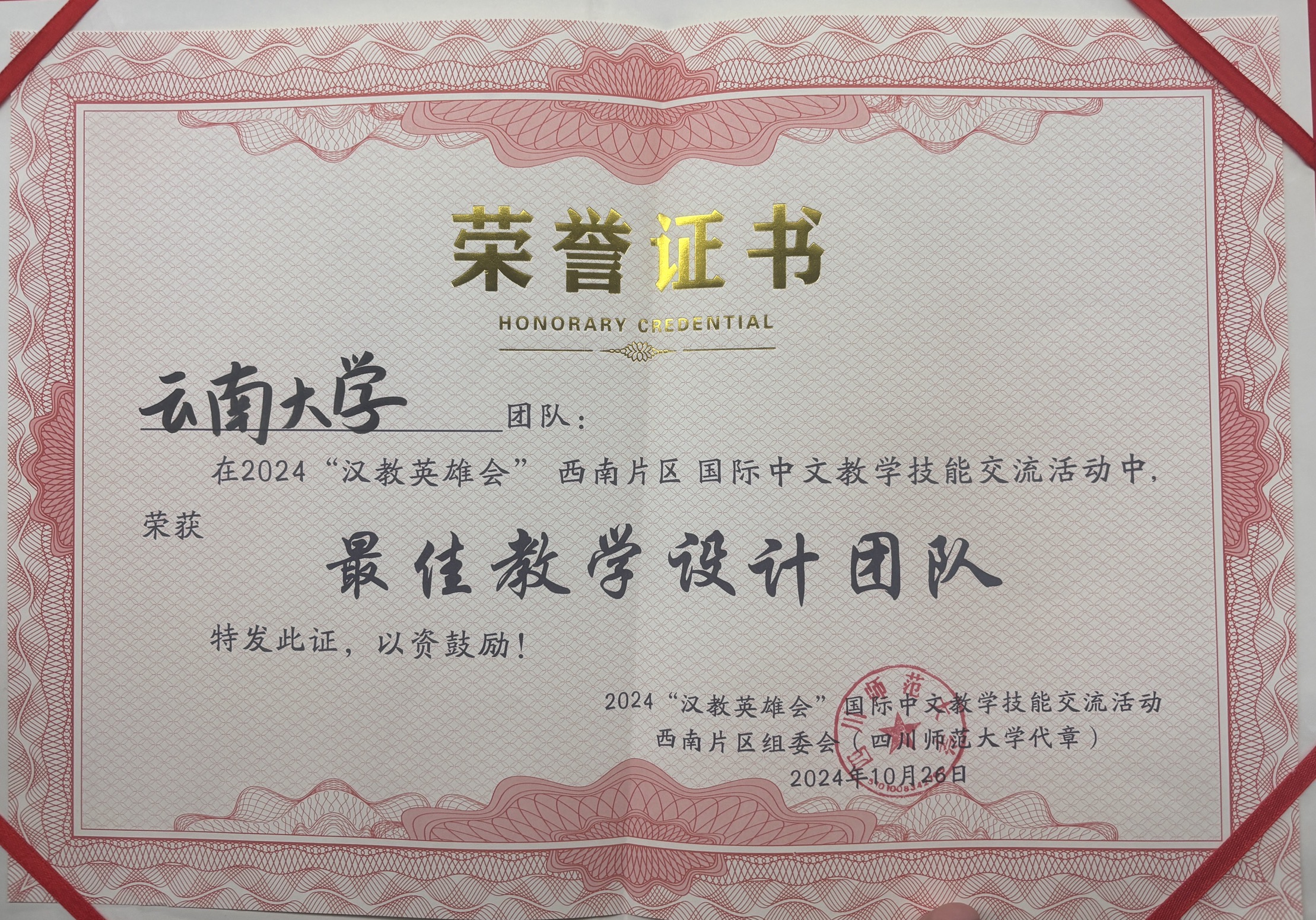2024年10月26日,由教育部中外语言合作交流中心、全国汉语国际教育专业学位研究生教育指导委员会联合主办的2024年“汉教英雄会”西南片区国际中文教学技能线下交流活动在四川师范大学举办。本次活动以“标准引领、创新驱动”为主题,共有来自16所院校的10支教师团队和11支学生团队参加线下交流活动,我院学生团队经过激烈角逐,在11支学生队伍中脱颖而出,获得“最佳教学设计团队”称号。