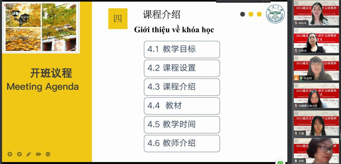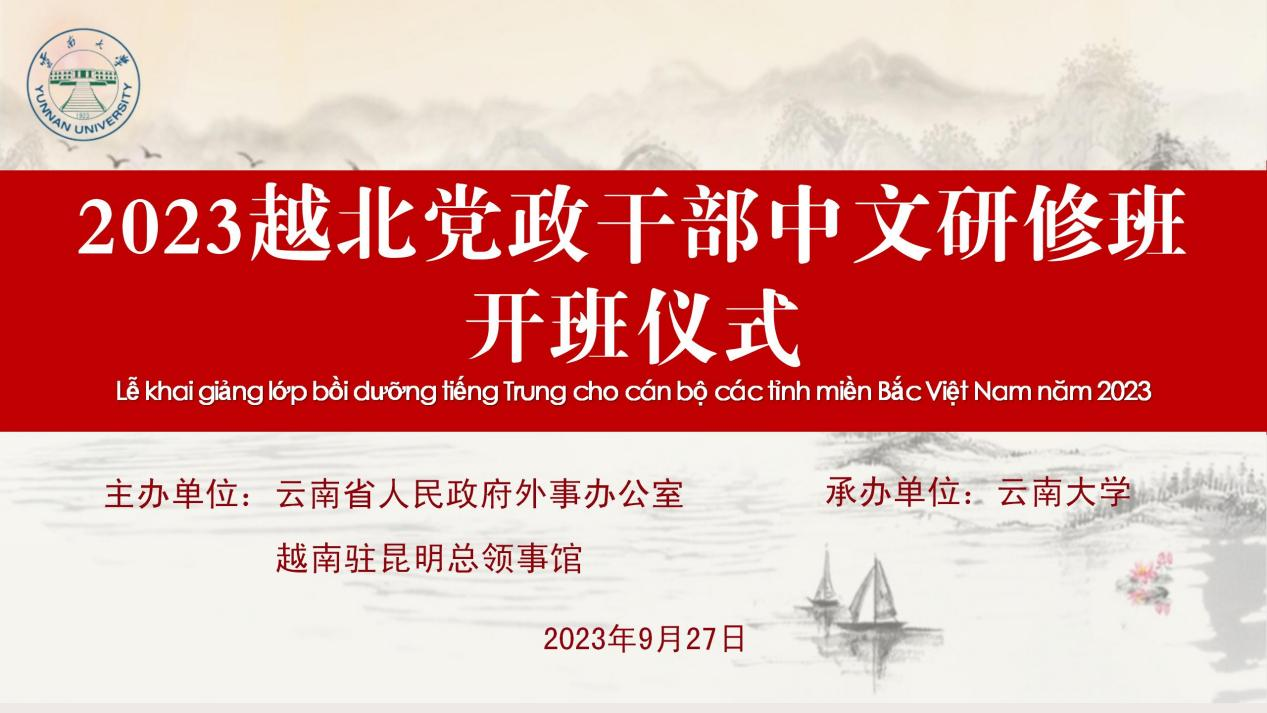 在秋风送爽、金风玉露的时节,2023年9月27日,由云南省人民政府外事办公室和越南驻昆明总领事馆主办、云南大学承办的2023年度“越北党政干部中文研修班”线上课程开班仪式通过视频方式在中越两地9省成功举行。越北相关省市涉外干部、云南大学国际合作与交流处、汉语国际环球UG网址等相关部门代表,以及研修班任课教师、语言辅导老师、翻译及志愿者出席线上开班仪式。