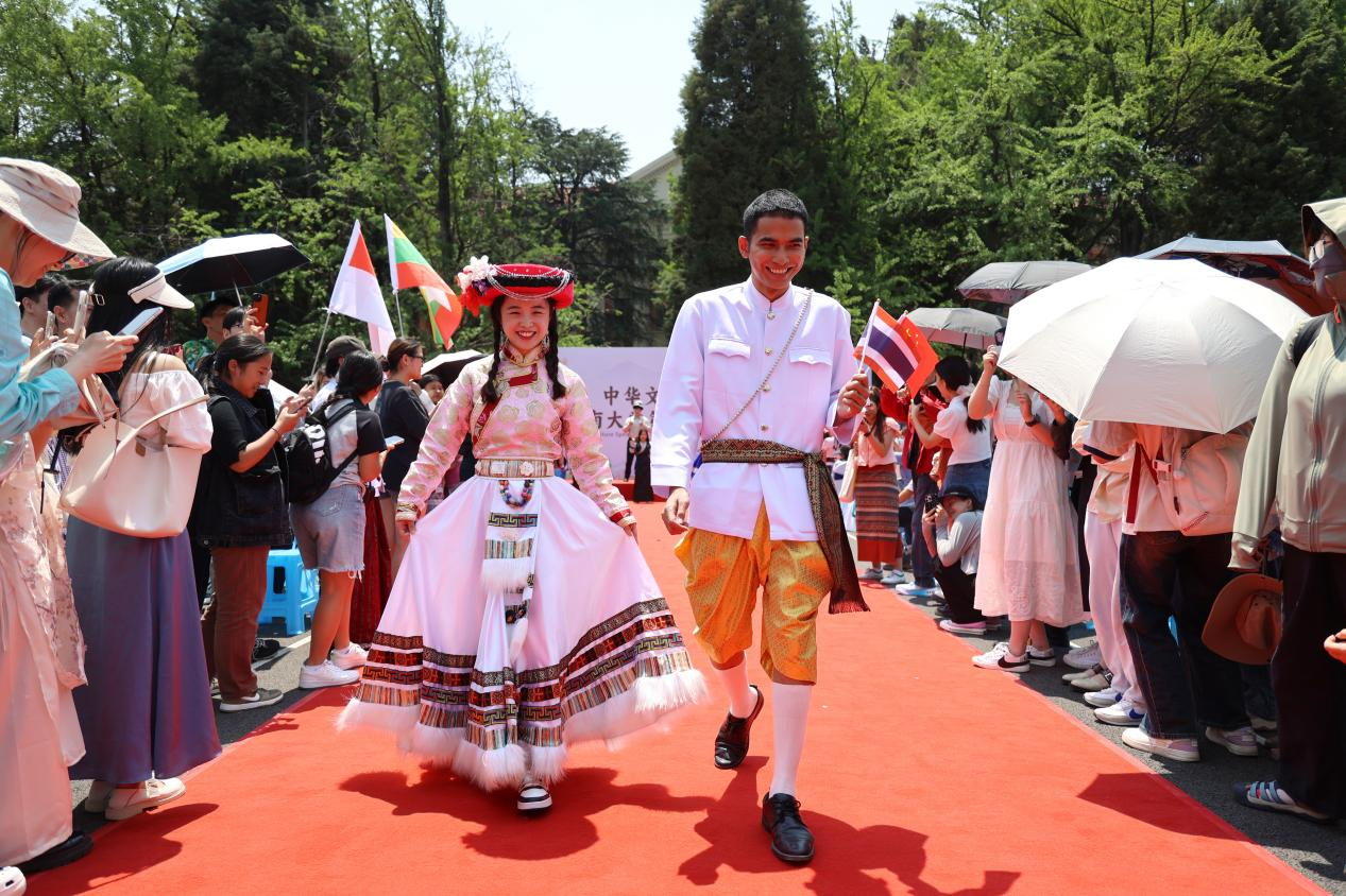 开幕式后,中外学子们在特色歌曲的伴奏下挥舞着各自的国旗绕校巡游,一路上,不同国家、不同民族的服饰多姿多彩,架起了一座中外文化互鉴的友谊桥梁。